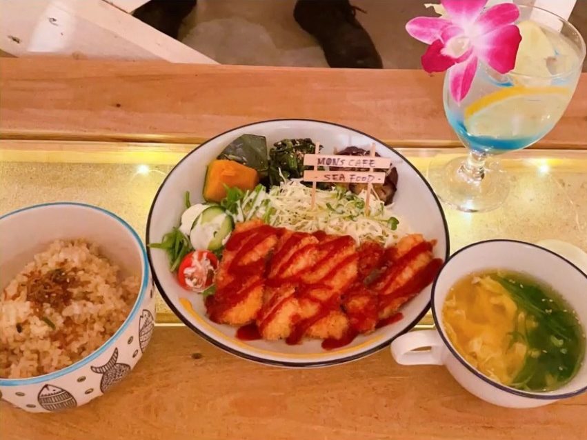 南国風プレート、ハワイアンブルーのドリンク